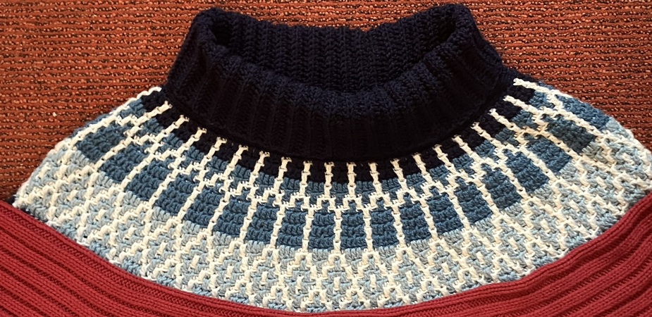 Für den Schalkragen benötigst du von jeder Farbe 1 Knäuel, aber von dunkelblau zur Sicherheit 2 Knäuel (wegen des Rollkragens).