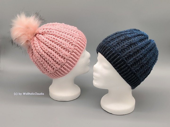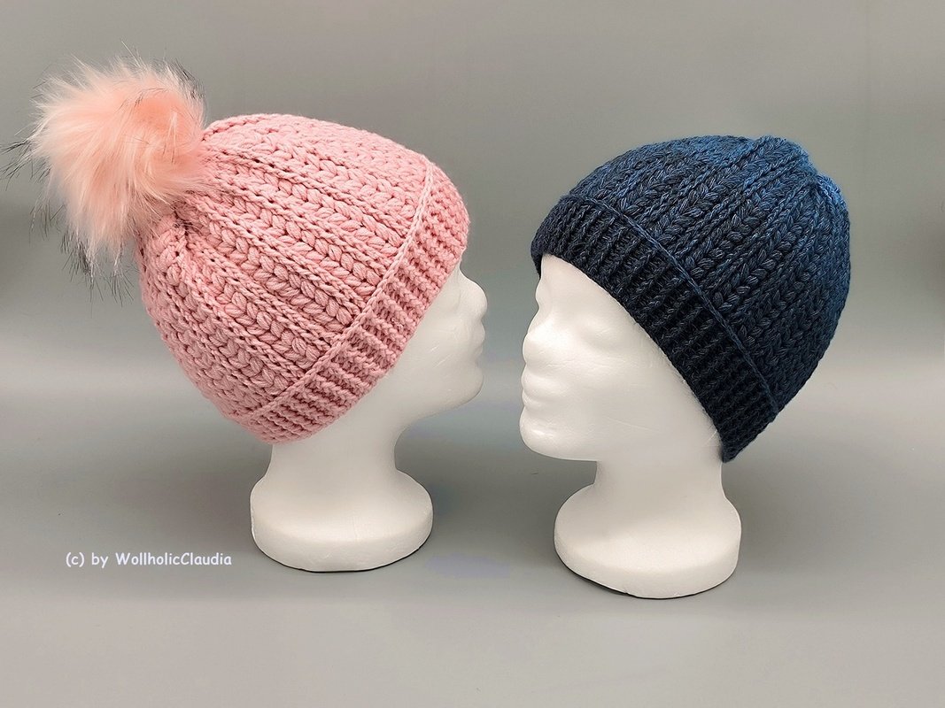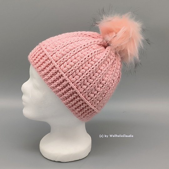 Beispiel hier Mütze rosa: KU = 54 cm, Mützenhöhe = ca. 17,5 cm.