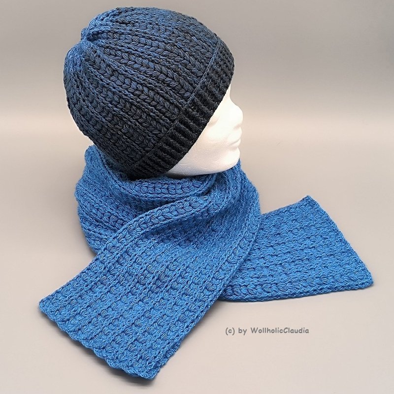 Hier nun auch als Set bestehend aus Mütze und Schal. Es besteht aus einem relativ einfachem Muster und kann sowohl von Herren/Jungen als auch von Damen/ Mädchen getragen werden. Die Mütze sowie auch der Schal sind natürlich individuell in der Länge bzw. der Größe/ Breite und mit jedem beliebigen Garn und der dazu passenden Nadelstärke machbar.