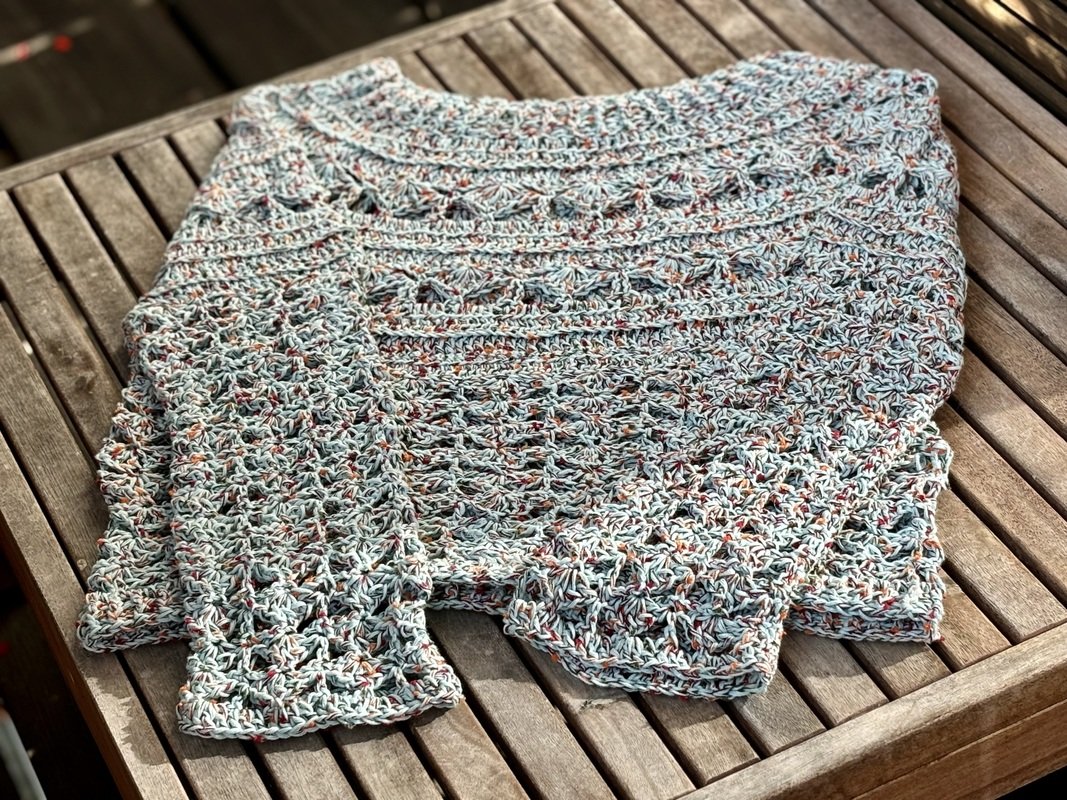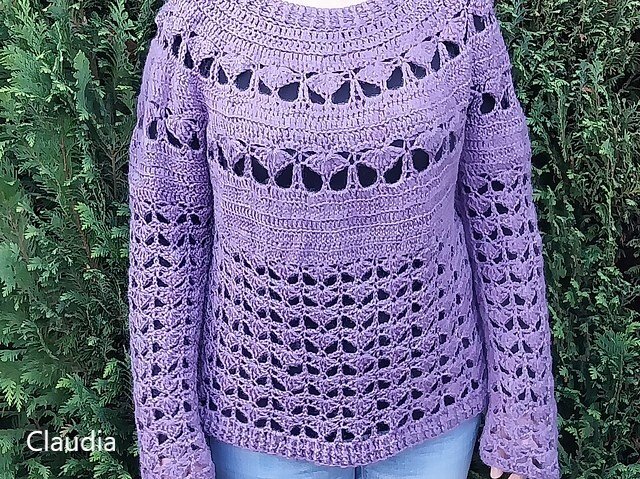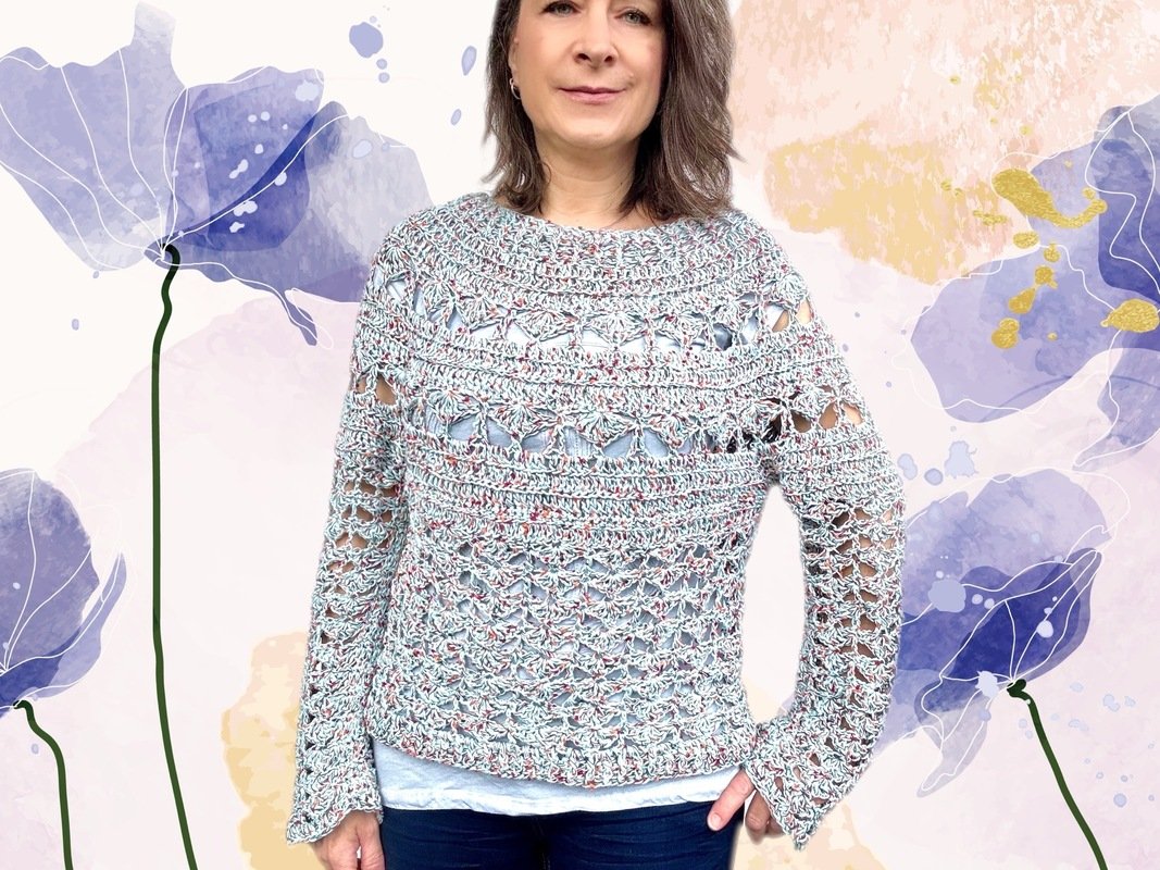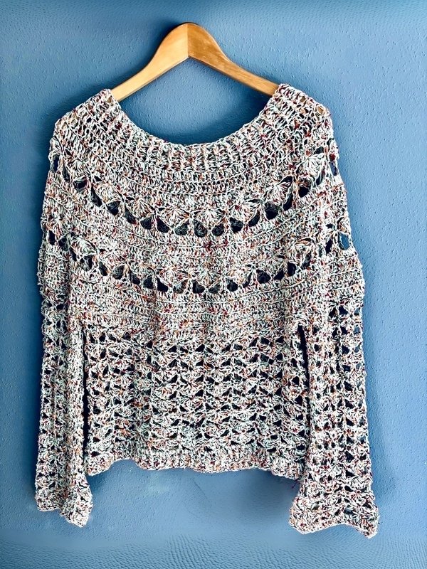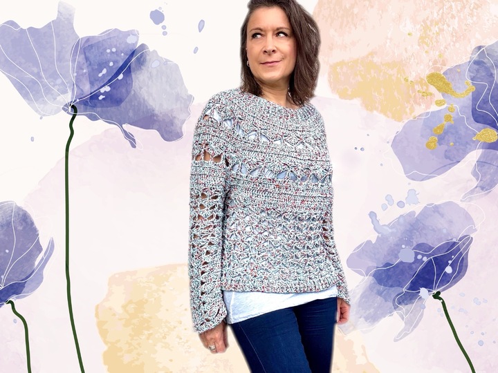 This top-down crochet sweater is entertaining to work up and wear. The modern crochet stitches add texture to your outfit and create a wardrobe piece you will want to wear especially in spring and fall.