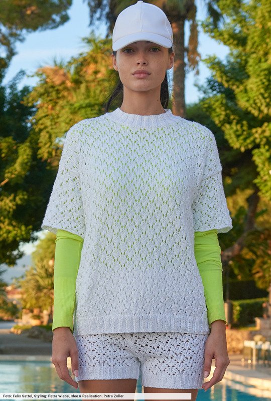 Klar, unkompliziert und stets mit einer femininen Note versehen: Mit dieser Stilistik geht Strick in dieser Saison an den Start. Mit dabei: dieses Ensemble bestehend aus Kurzarmshirt und Shorts, die sich beide in einem hübschen Ajourmuster präsentieren, für das wir eine übersichtliche Strickschrift in unserer Anleitung angefertigt haben. Aus weicher, leicht aufgerauter Baumwolle in strahlendem Weiß ein Traum für Sport und Freizeit.