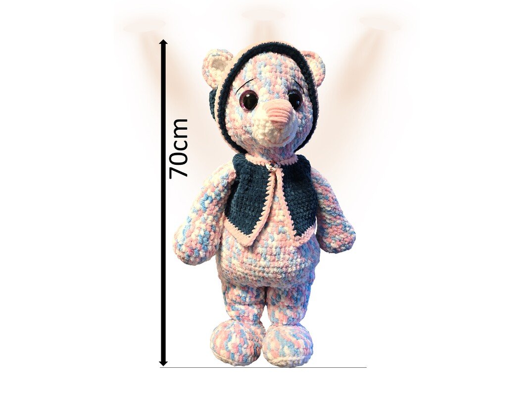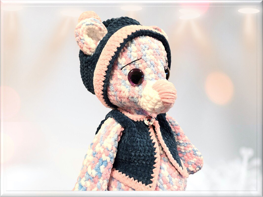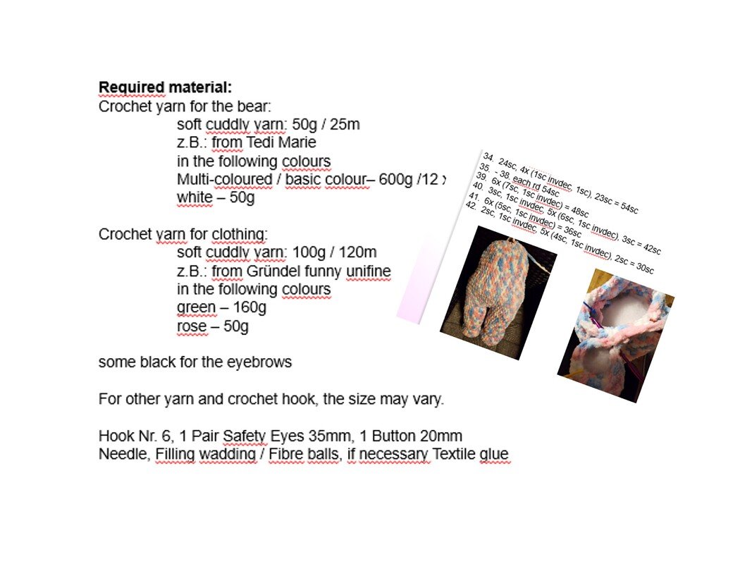 This article is an illustrated, detailed PDF tutorial for the cuddly bear with hat and vest on 12 pages and numerous pictures.