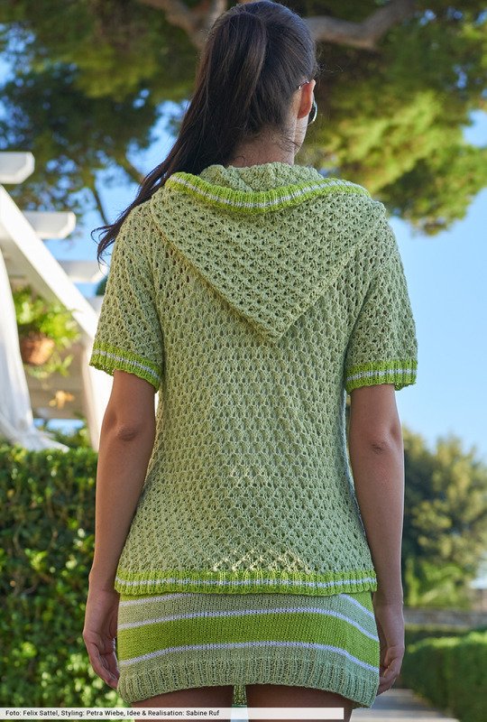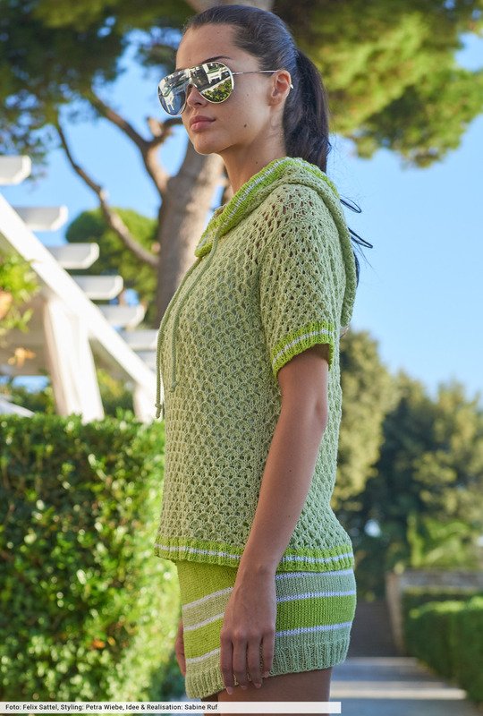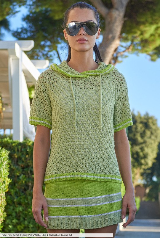 Strick geht auf Fashion-Streife, beim Hoody nur in den Bündchen und Kapuzenkanten, beim Rock etwas ausgeprägter im Colourblocking. Extrem trendverdächtig ist die neue Power-Kombintion aus strahlenden Grüntönen, die wir mit reinem Weiß ergänzt haben. Beim Oberteil kommt ein leicht transparentes Ajourmuster ins Maschenspiel, den verführerische Minirock haben wir glatt rechts gestrickt. Auf jeden Fall ein Dreamteam mit jeder Menge Bewegungsfreiheit.