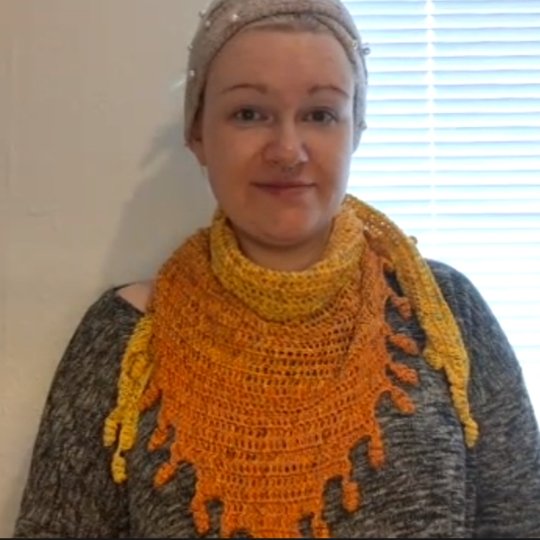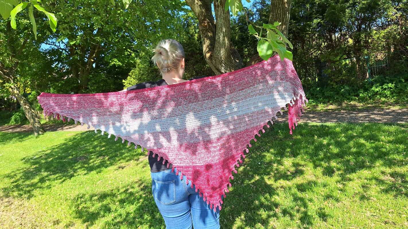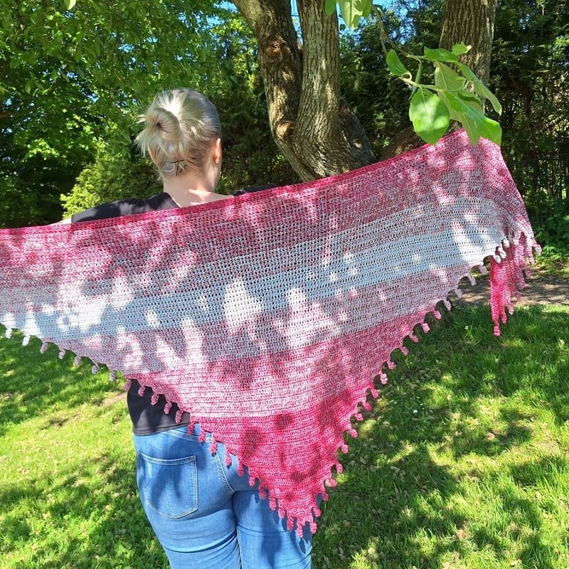 A crocheted symmetrical triangle shawl with a playful edging of corkscrew curls. This shawl is perfect for beginners. The corkscrew curls add a unique and whimsical touch, making it a charming accessory – ideal for young girls or adults who love playful details.