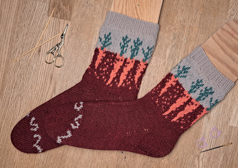 The sock is knitted top down. With a needle set of 2.5 mm. I used 4-ply sock yarn.