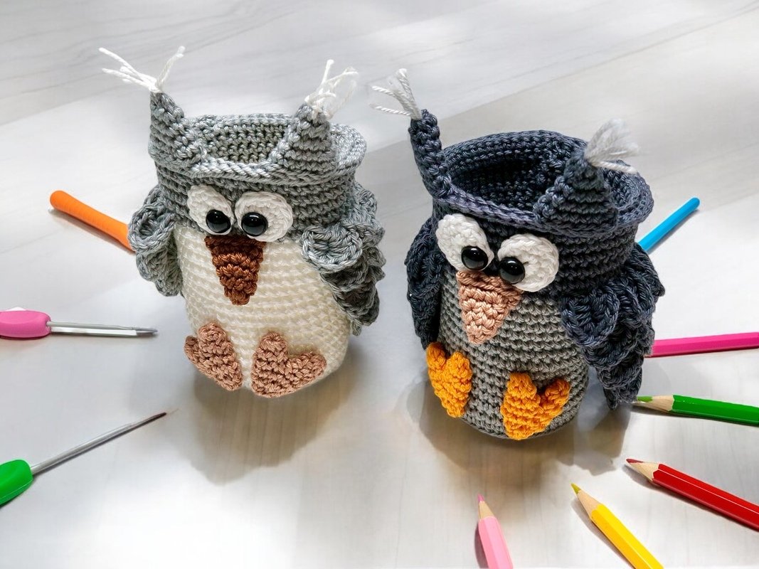 Bring charm and organization to your desk with this adorable owl pen holder! The double-layered crochet design makes the holder sturdy and perfect for crochet hook, pens, brushes, and more. Especially cute: the fluffy feathers and tiny, clumsy feet, created using simple techniques.
