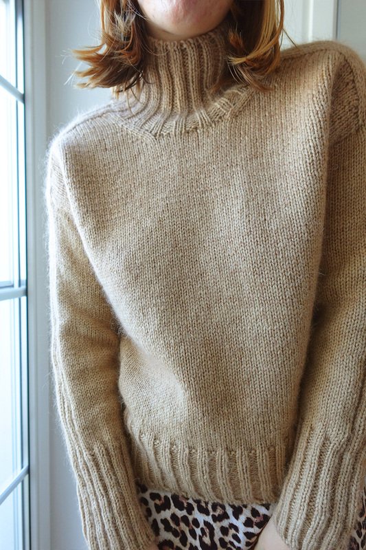 The Elva Sweater Knitting Pattern is a long, loose-fitting sweater with sophisticated saddle shoulders. The shoulders are knit in a rib pattern that starts at the collar, runs down the shoulder and all the way down the sleeve into the cuff. The Saddle Shoulder Sweater Knitting pattern has a yoke that is shaped with German short rows for a good fit, and the neckline is shaped with increases alongside the short rows. The sweater knitting pattern is worked top down, so the length is fully adjustable. The Elva Sweater features a turtleneck, which is also knitted in ribbing, giving the sweater a wintery, cozy look. The sleeves are designed with a little extra length to complete the casual, modern look of the sweater. Knit a sweater with saddle shoulders with this knitting pattern.