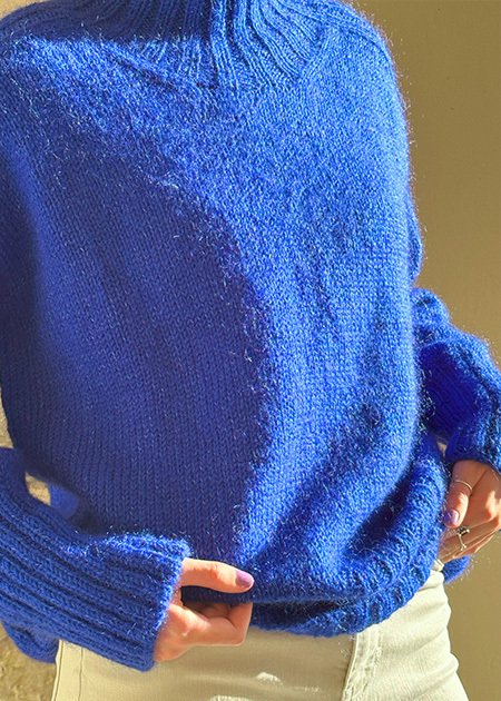 Our blue Elva sweater is knit in “Friends Wool” & “Friends Kid Silk” from Hobbii, both in col. 85 Sapphire.