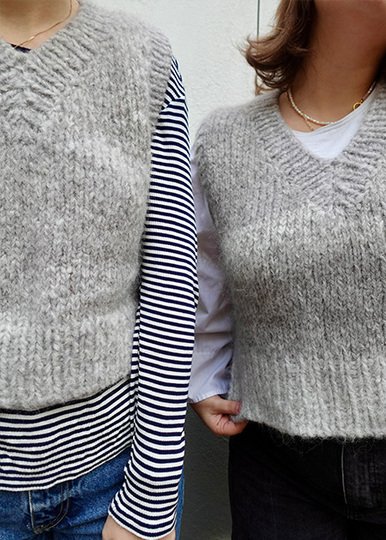The slipover is knitted with three strands, with two strands of “Avio” and one strand of “Silkhair”.