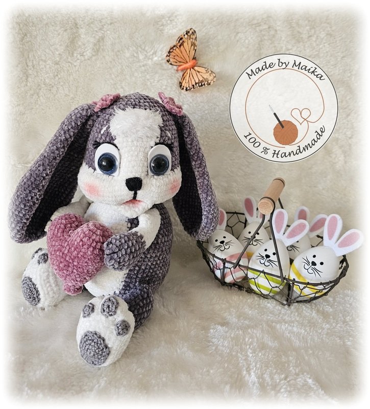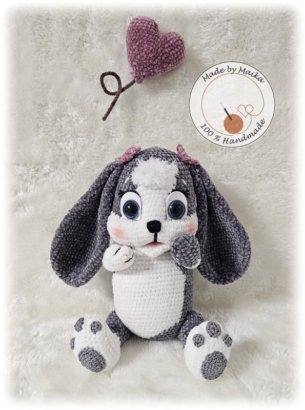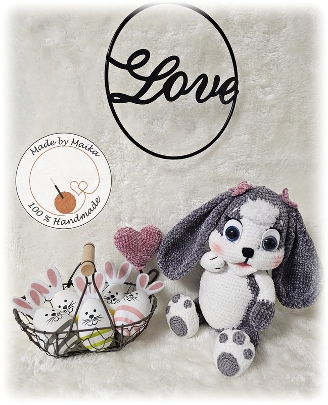 Mit der angebenen Wolle und Häkelnadel wir der Schlappohrhase ca. 25cm. Dies kann aber immer vaiieren, jeder häkelt anders, fester oder lockere.