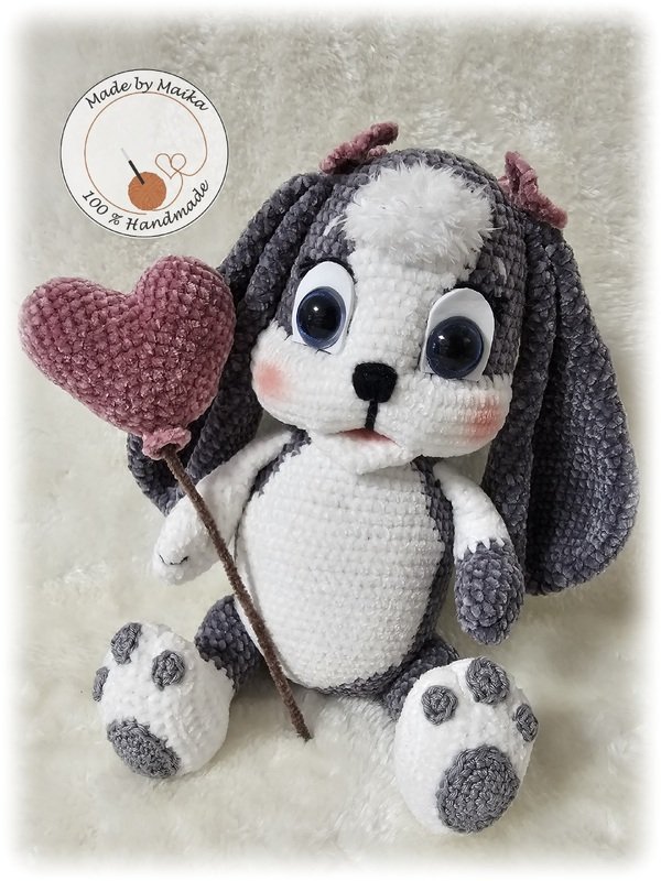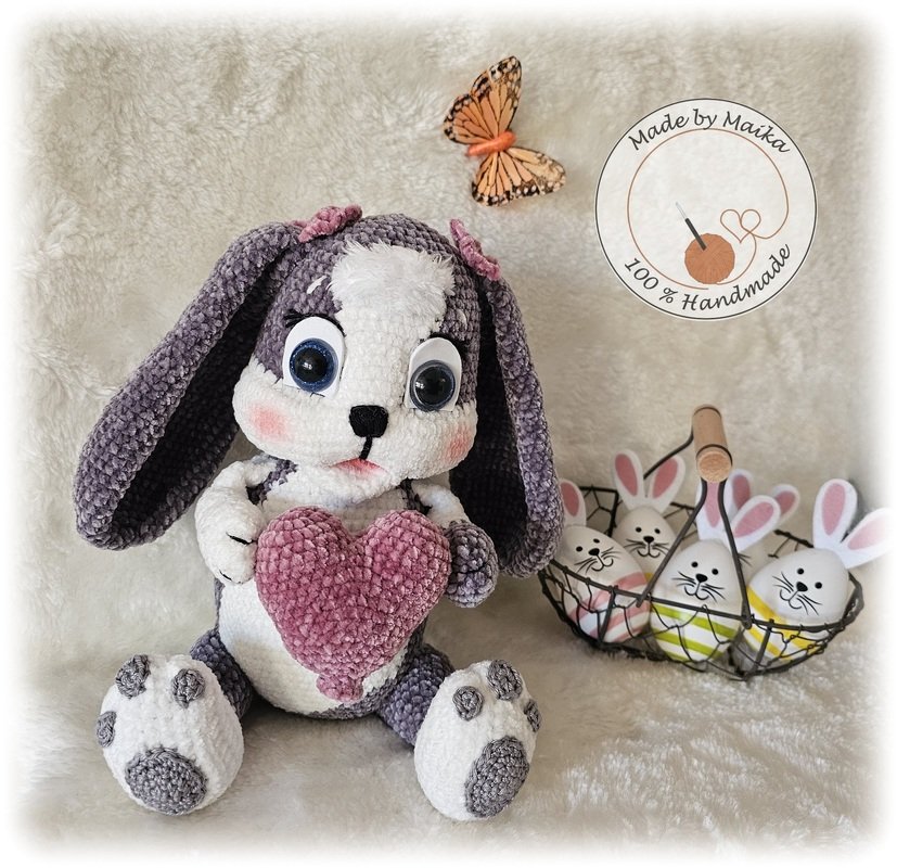 Schaut mal, wer hier gehoppelt kommt! Ein kleiner grau-weißer Schlappohrhase mit den größten Kulleraugen, die ihr je gesehen habt. Er ist nicht nur super kuschlig, sondern auch ein treuer Begleiter für Groß und Klein. Perfekt für der Osterkörbchen, Kinderzimmer oder einfach als süßer Glücksbringer.