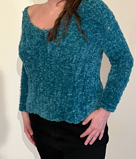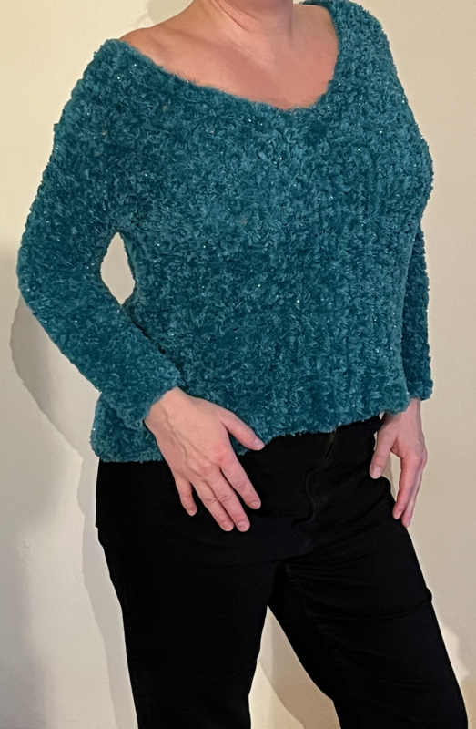 This crochet pattern is perfect for fluffy fancy yarn. The sweater is crocheted entirely with single stitches, as the fluffy yarn itself has an effect. The glitter of the wool gives the sweater an elegant touch.