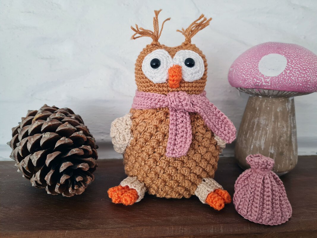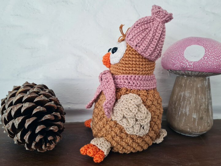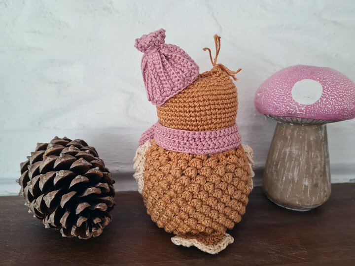 The hat and scarf are not permanently attached to the owl, so it can easily be transformed from a winter owl into a spring owl ;)