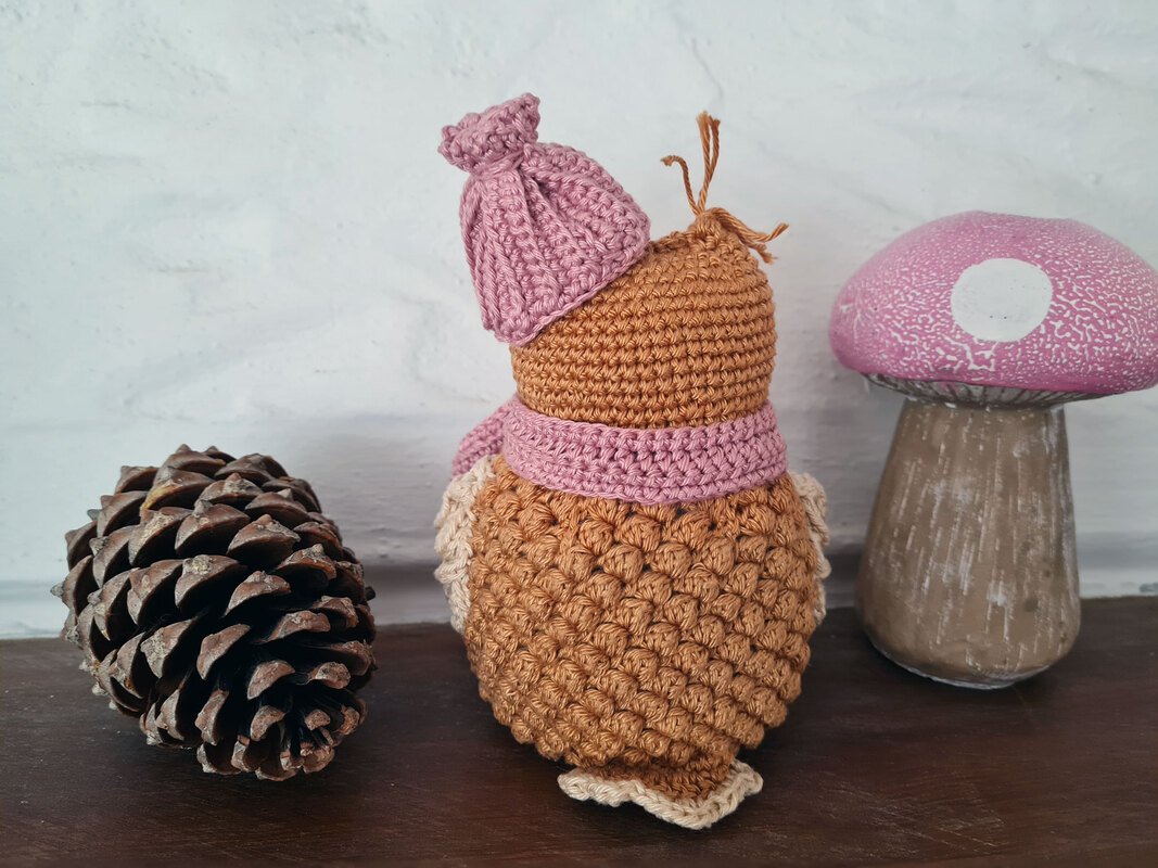 The finished owl is approx. 6.6“ tall (body, measured without hat) with sport or light worsted yarn (125g/50m)