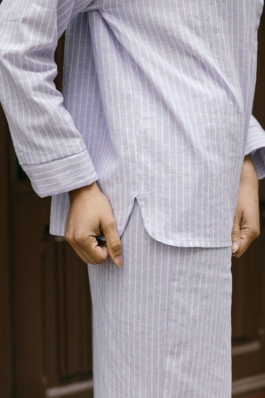 The Serena Blouse has an oversized cut and a positive ease of about 35cm (14“) around the bust and 65 cm (26“) around the waist. For reference: Our model Djamila is 170cm (5′ 7′′) tall and wears size S.
