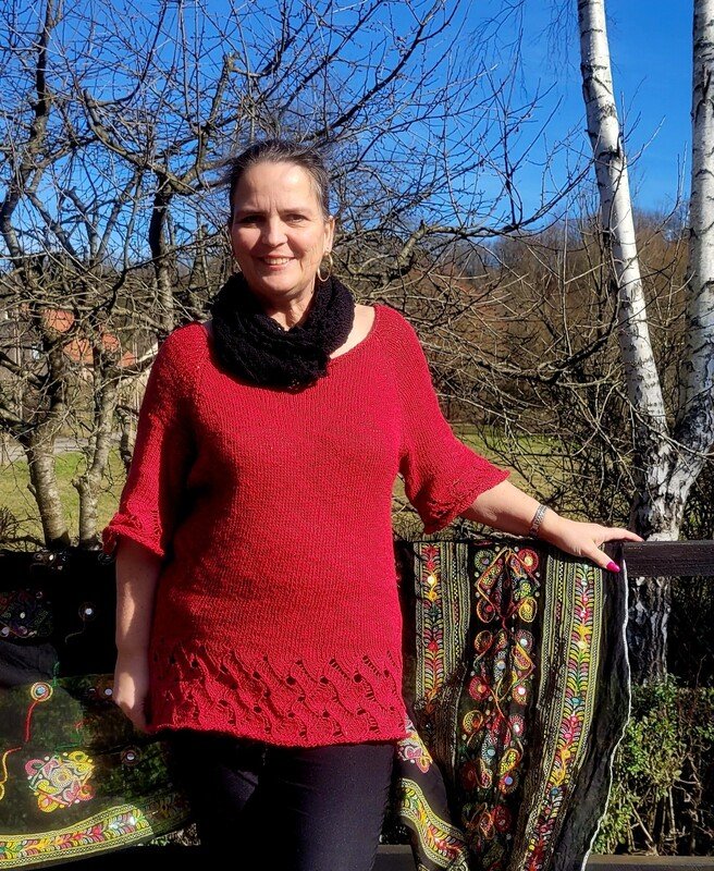 Er wird in Runden gestrickt und hat (trotzdem ) einen rechteckigen Ausschnitt.