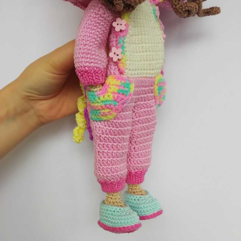 This crochet pattern contains a detailed description with a lot of step-by-step photos of how to make a doll body, hairstyle, embroider the face, jumpsuit and shoes.