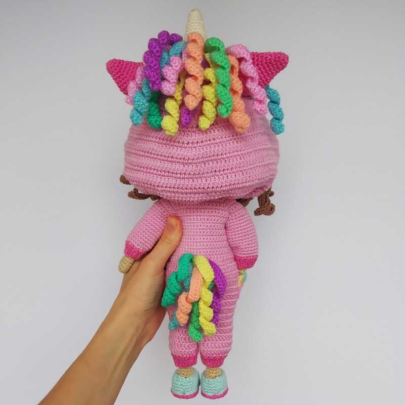 • Catania yarn or FIOCCO (100% cotton; 50 g/125 mt; 1,75 oz/137 yds) 404 skin color (80 gr) for body, 402 light green-blue (2 yds/2 m) and 110 black (2 yds/2 m) for eyes, 105 Ivory (< 1 ball) for eyes, horn and tummy, 254 brown (80 gr) for hair, 256 coral (1 yds/1 m) for the lips, 222 light pink (80 gr), 225 pink (25 gr), 280 yellow (7 gr), 226 purple (7 gr), 397 blue (7 gr), 389 green (7 gr) and 401 peach (7 gr) for jumpsuit, 385 aquamarine (7 gr) for shoes;