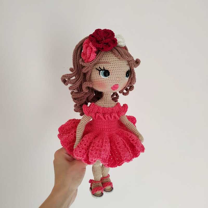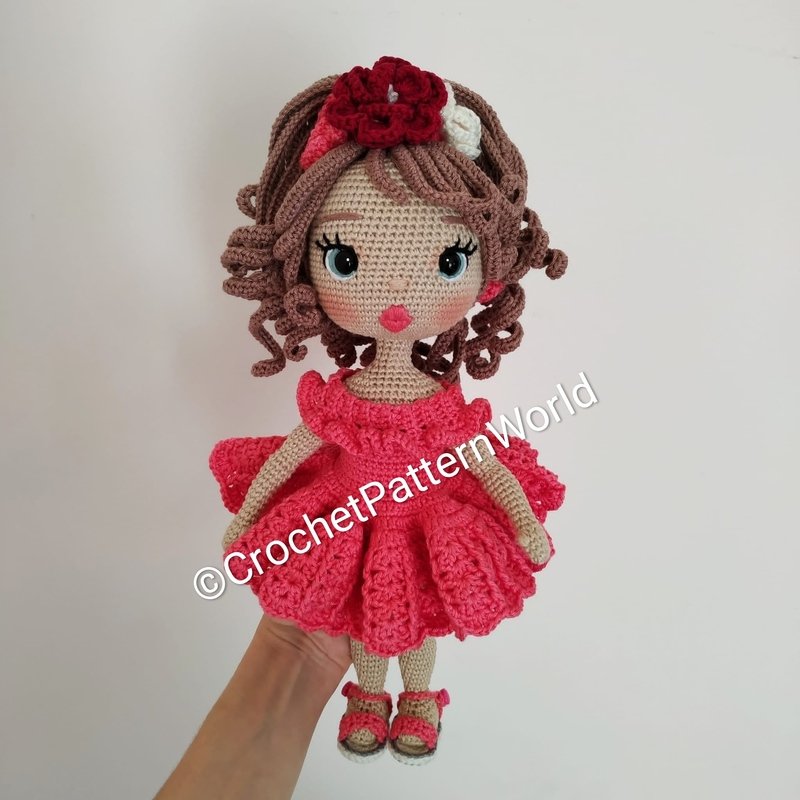 This crochet pattern contains a detailed description with a lot of step-by-step photos of how to make a doll body, hairstyle, embroider the face, dress, shoes, ribbon and panties.