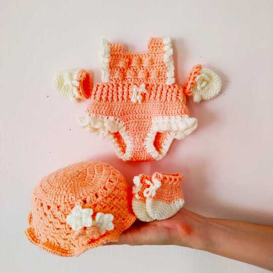 • Crochet bodysuit for baby doll, gloves, hat and booties