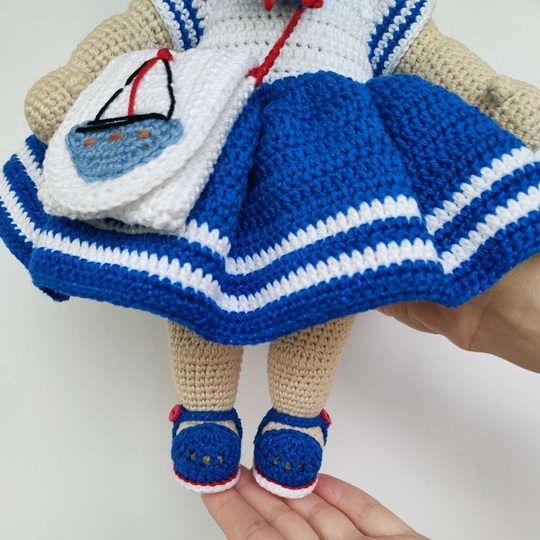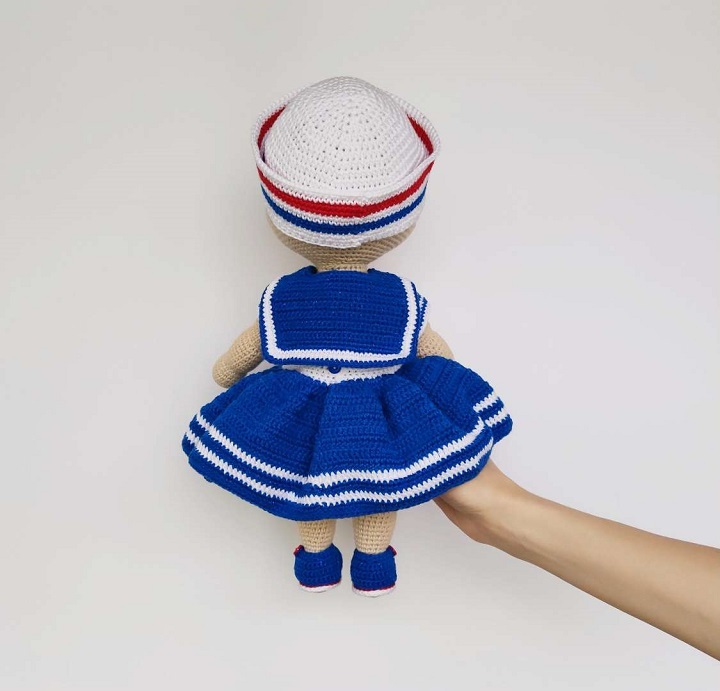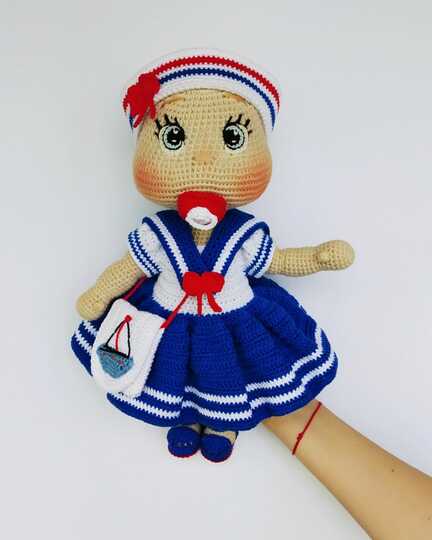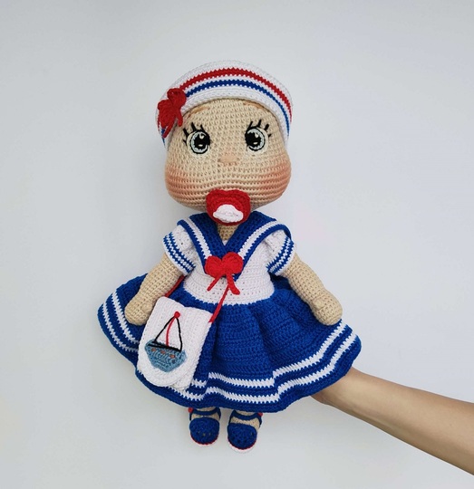 This crochet pattern contains a detailed description with a lot of step-by-step photos of how to create baby doll Lulu with marine outfit.