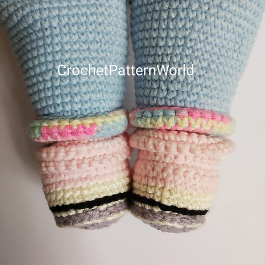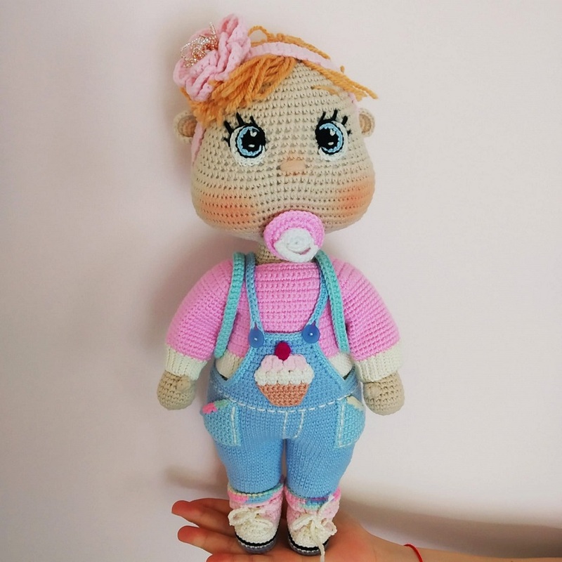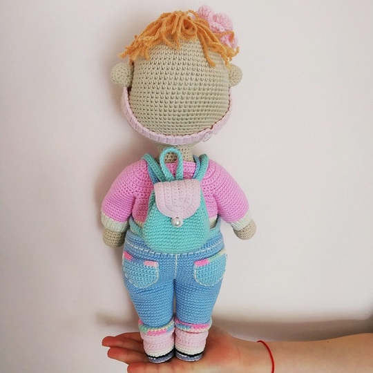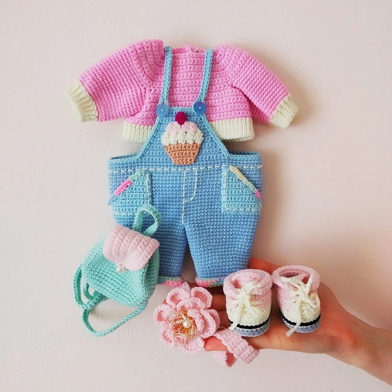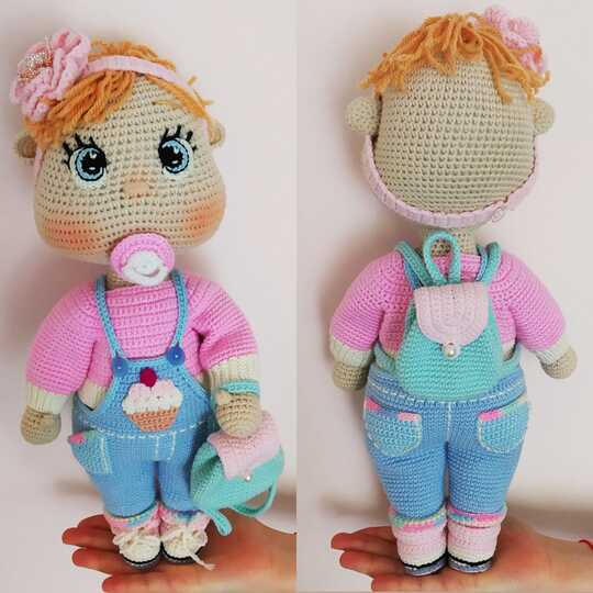 This crochet pattern contains a detailed description with a lot of step-by-step photos of how to create Baby Doll in T-shirt, jeans and sneakers, with headband and backpack.