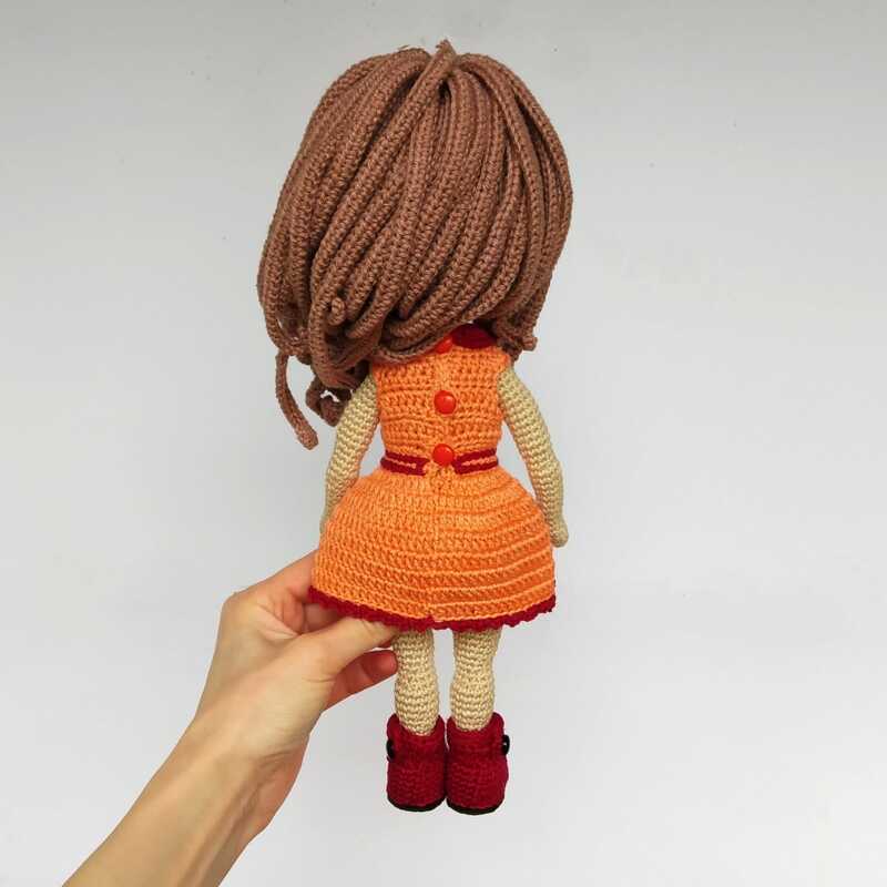 This crochet pattern contains a detailed description with a lot of step-by-step photos of how to make a doll body, hairstyle, embroider the face, dress, coat, hat, scarf, boots, and panties.