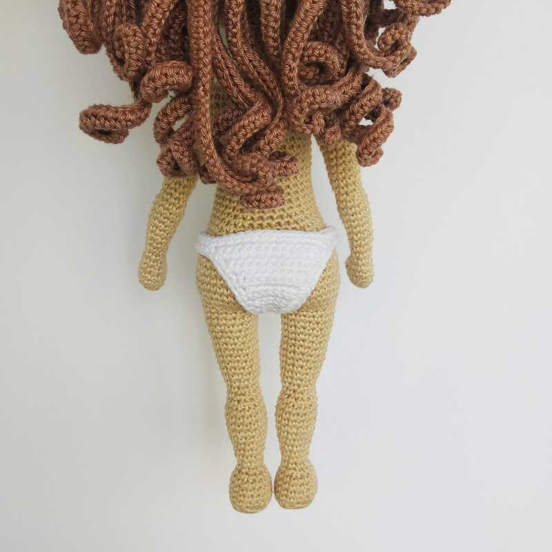 With this patterns you will get Doll Astrid about 30 cm (11,8 inch) high. The dimension depends on yarn size and crochet hook size. I used the size hook 2.00 mm (US B/1) and yarn for body and clothes - 100% cotton (50 g/125 m; 1,75 oz/137 yds)