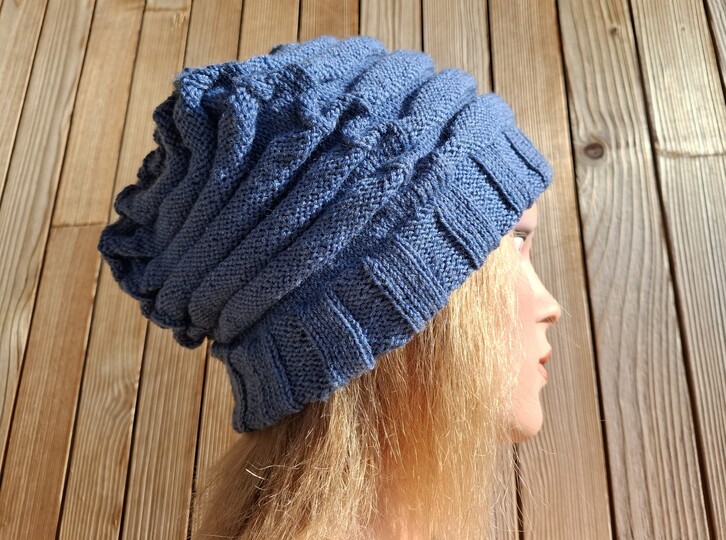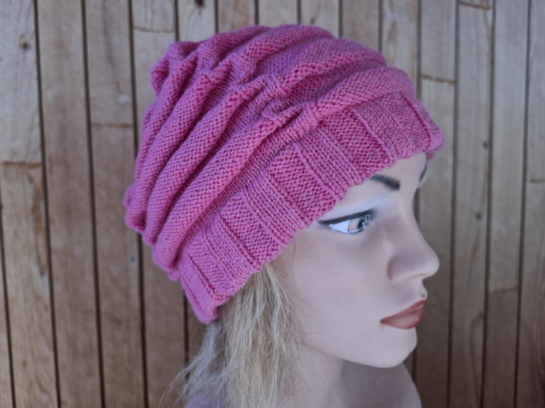 You can use any wool with a yardage of 420m / 100g. I used 1 ball (100g) of “Meilenweit Soja” from Lana Grossa for the blue hat and 2 balls (50g each) of “Vielseitige 210” from Ferner Wolle for the pink hat.