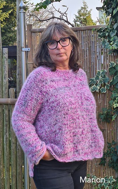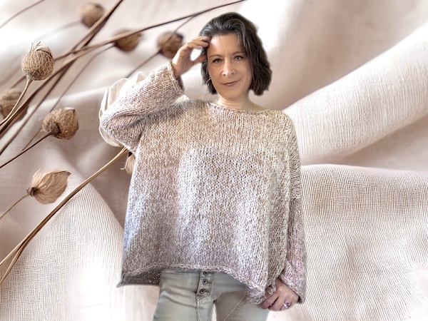 I wanted a huge, cozy sweater that embraces me on cold days. No frills, easy and quick to knit: Et voilà: here it is! This project is perfect to hold different blow yarns or fluffy leftovers together which makes it light while keeping you warm. Using large needles it knits up quite quickly. It’s great for beginner knitters and fun for the more advanced as well.