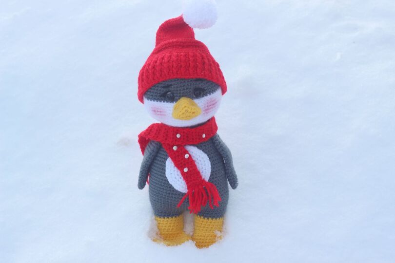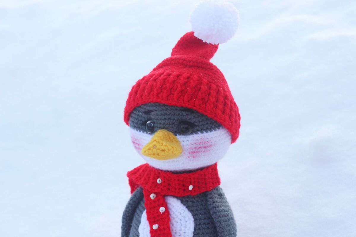 Crochet pattern for a sweet penguin amigurumi wearing a bright red hat and a scarf. A lovely giveaway or a unique gift for friends and relatives.