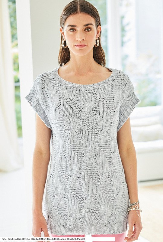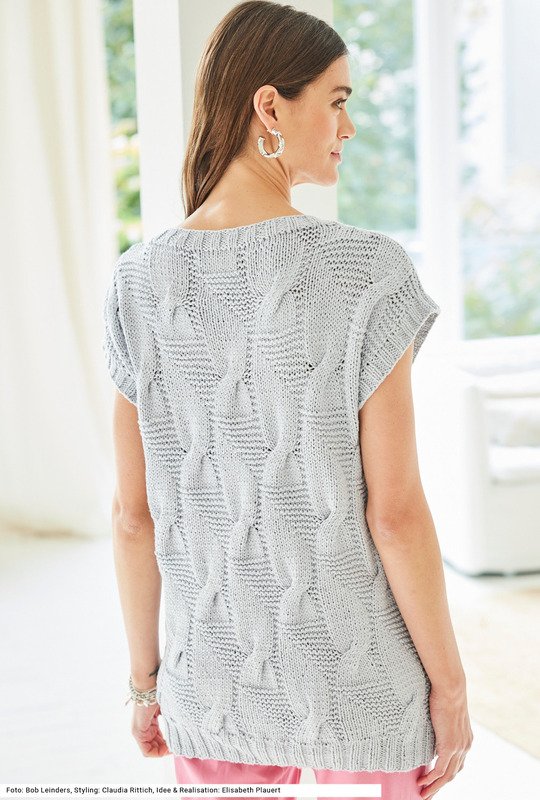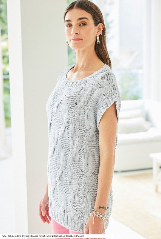Dieser überaus anschmiegsame, oversized geschnittene Pullunder mit weitem Rundhalsausschnitt passt perfekt zu einem sowohl sportlichen als auch femininen Look. Das verdankt er den schwungvollen plakativen Verzopfungen in glatt rechts mit auslaufenden Flächen in kraus rechts. Saum-, Ausschnitt- und Ärmelblenden sind im Rippenmuster 2 Maschen rechts, 2 Masche links gearbeitet. Das Gestrick ist aus einem veganen Kettgarn aus Baumwolle, Viskose und Polyamid ohne tierische Fasern. Die Anleitung hierfür kann in den Größen 36/38, 42/44 und 48/50 downgeloadet werden.