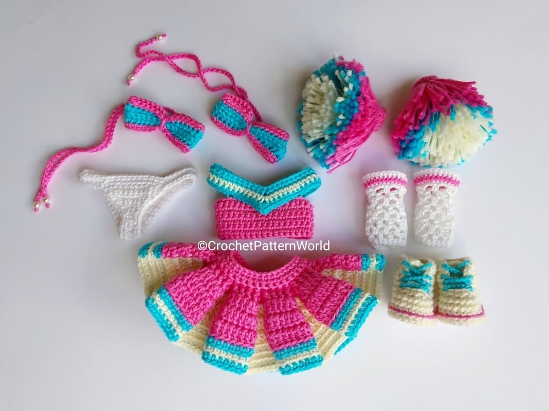 This crochet pattern contains a detailed description with a lot of step-by-step photos of how to create clothes for doll Astrid: crop top, skirt, sneakers, leg warmers, gloves with pom-poms, ribbon, panties.