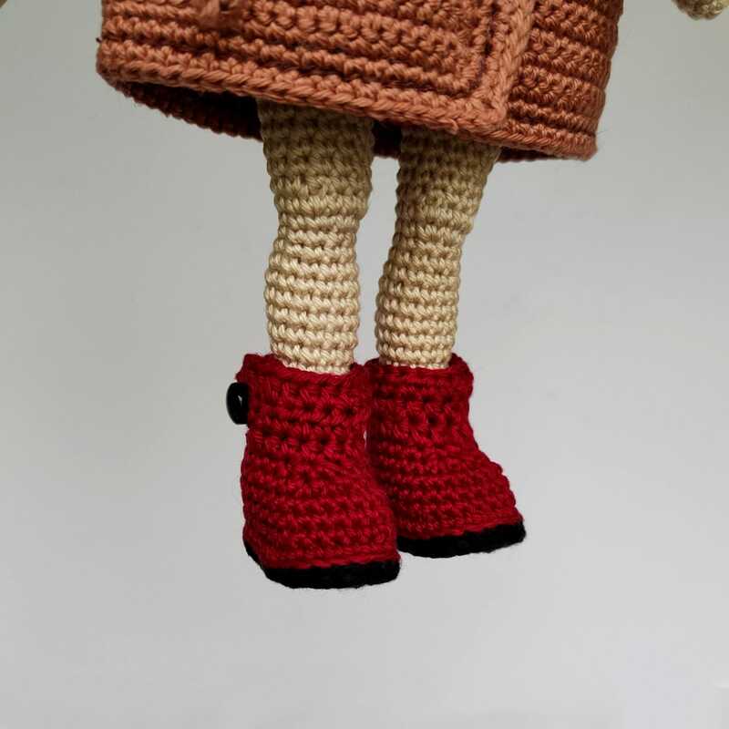 • Catania Schachenmayr yarn or FIOCCO (100% cotton; 50 g/125 mt; 1,75 oz/137 yds) 192 burgundy (45 gr) for the hat, boots, dress, scarf, 410 coral (20 gr) for the dress, 426 brick color (48 gr) for the coat, 106 white (5 gr) for panties, 110 black (5 gr), 419 green (3 gr) for the scarf;