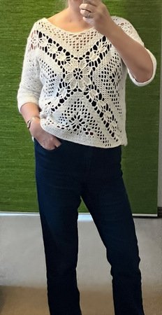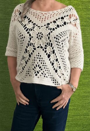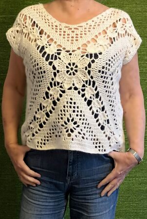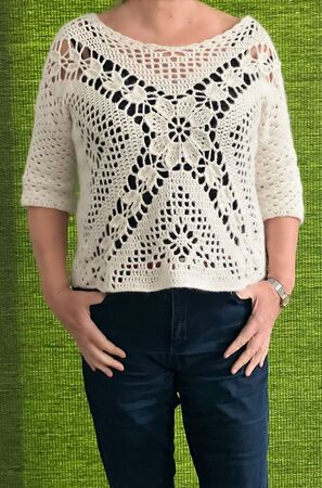 Vor Kurzem habe ich ein Vier-Granny-Top vorgestellt. Jetzt ein Top, welches nur aus 2 Grannys besteht: Eines als Vorderteil und eines als Rückenteil. Vorder- und Rückenteil sind identisch. Man kann es mit oder ohne Ärmel arbeiten. Ich habe es als Kurzversion (bis unter den Gürtel) in dünnerem Garn oder als Langversion (bis unter die Hüfte) mit volumigerem Polyacryl-Garn gehäkelt. Man kann es in Baumwolle häkeln, dann ist es eher was für die warme Jahreszeit, oder in Wolle, dann ist es mit Ärmeln auch ein wintertauglicher Pulli. Das Teil gehört zu meinen „Bauchwegschummlern, da es vorteilhaft ein Bäuchlein kaschiert