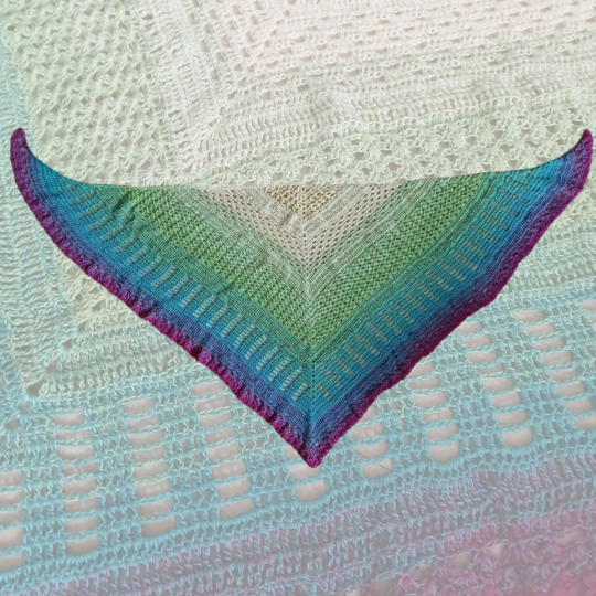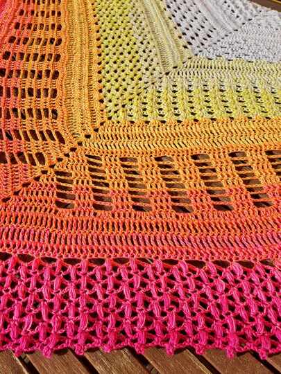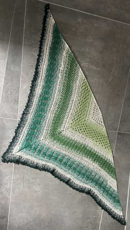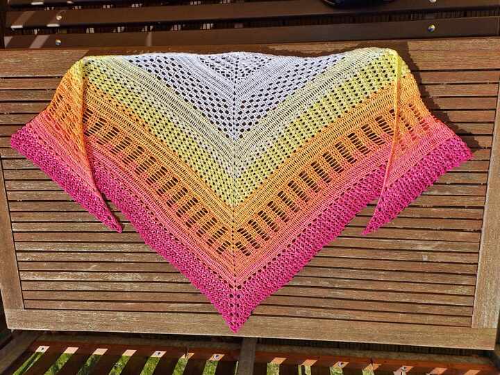 Mein Beispieltuch, gehäkelt mit einem Farbverlaufsbobbel 3-fädig/1.000m Lauflänge und NS 3,5, hat eine Spannweite von 1,98m und eine Tiefe von 0,80m erreicht.