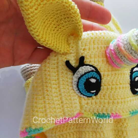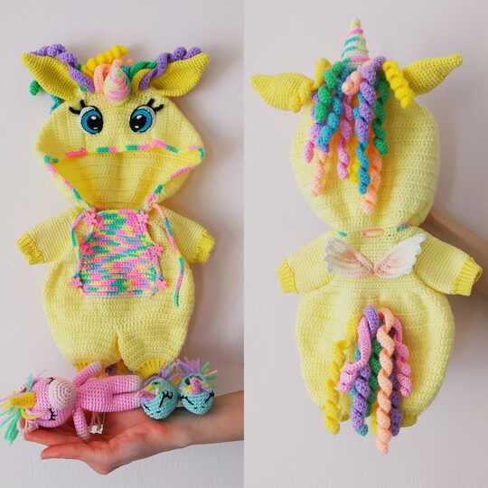 This crochet pattern contains a detailed description of how to create clothes for Doll in Unicorn jumpsuit, booties and amigurumi little unicorn toy with a lot of step-by-step photos.