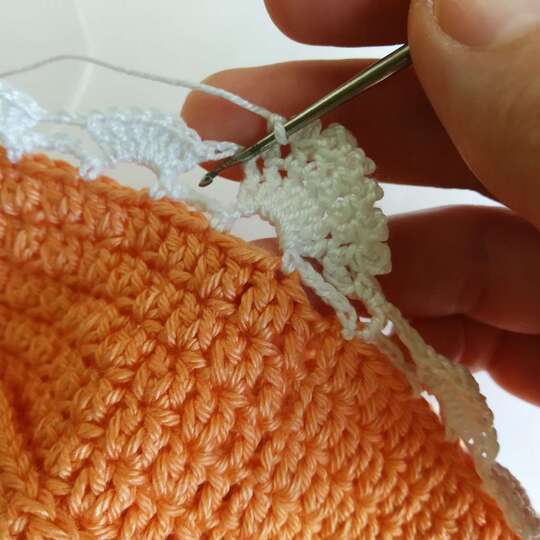 • Catania yarn or FIOCCO (100% Cotton; 50 g/125 m; 1,75 Oz/137 yds) 410 orange color (< 2 ball) for dress, 105 ivory color (1 ball) for shorts, flower and bunny décor, 225 pink color (1 yds/1 m) for the smile of the bunny décor, 205 green color (1 yds/1 m) for leaves;