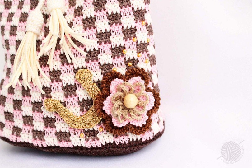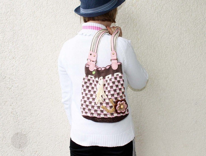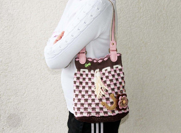 Es wird in der Anleitung "Tasche" erklärt: normaler Boden, fester Boden, Grundmuster, gehäkelte Taschengriffe, Blume, Kordel, Quaste, Hufeisen, Insgesamt 21 Seiten (über 30 Fotos).
