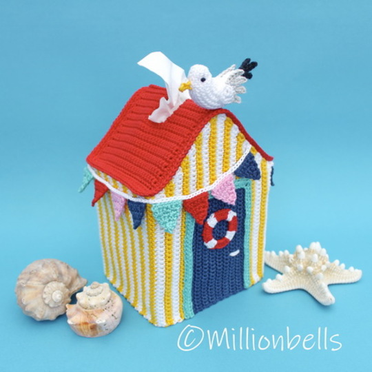 This pattern (US terminology) will guide you to crochet a cute and colorful beach hut tissue box cover as shown in pictures, including the life ring, bunting and seagull. The tissue box cover will be made using sport weight cotton yarn and crochet hook C (2.5 mm).