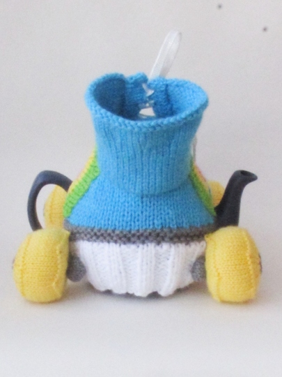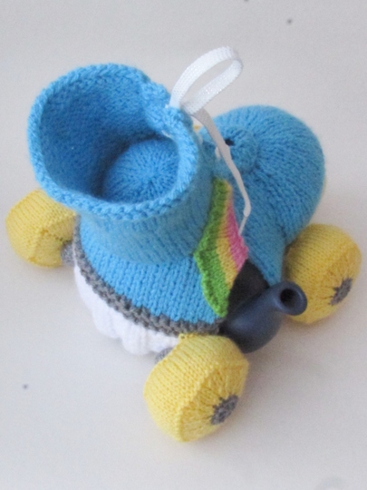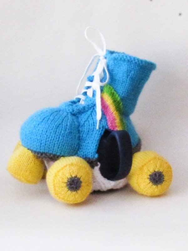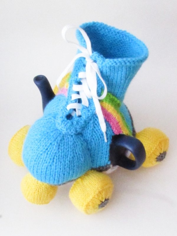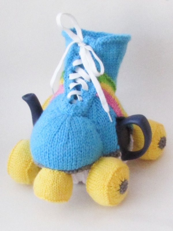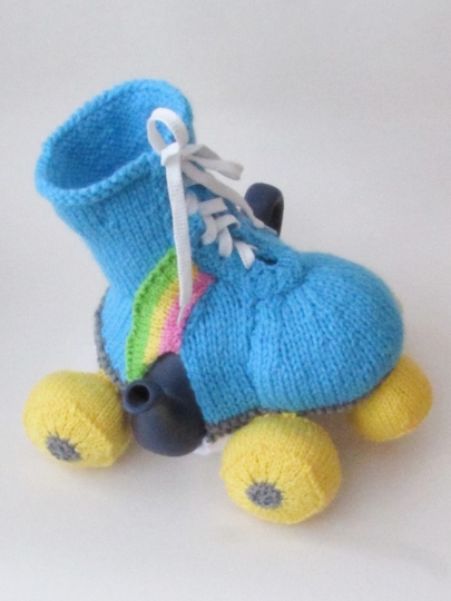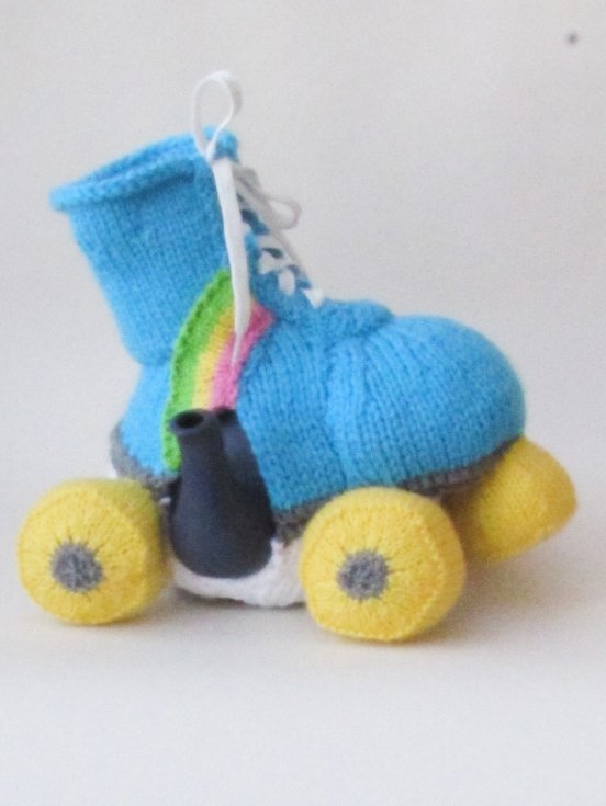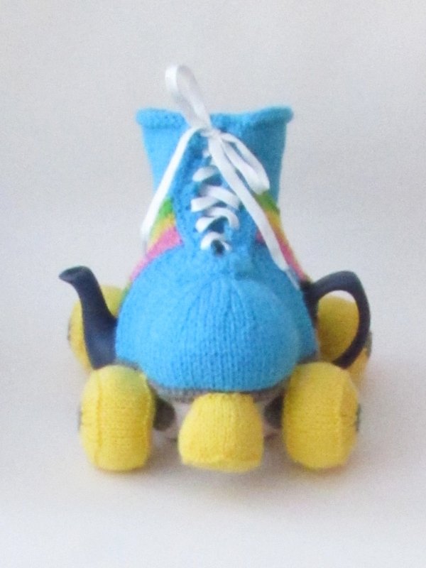 This product is the knitting pattern only; to knit your own Roller Boot tea cosy.
