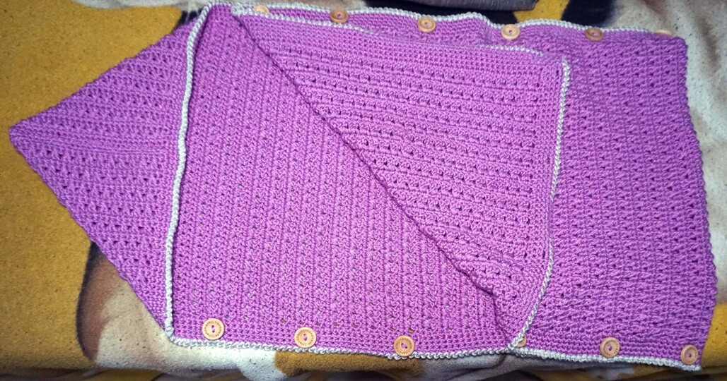 The footmuff crocheted according to these instructions is the perfect companion for walks with your baby in the baby carriage or infant carrier during the warmer months.