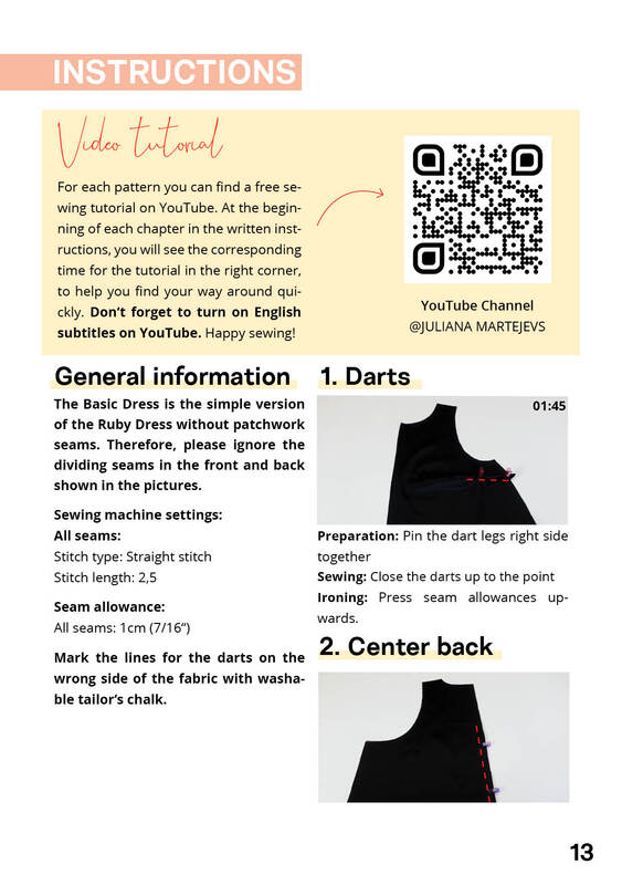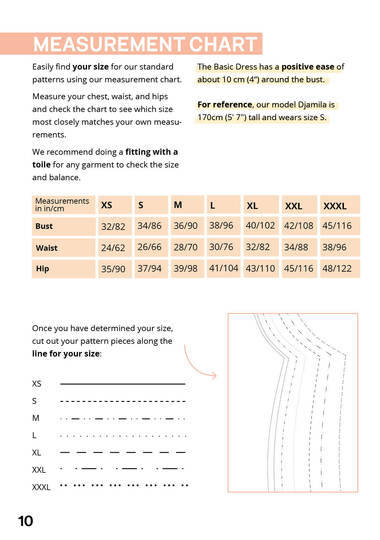 The Basic Dress has a positive ease of about 10 cm (4“) around the bust. For reference, our model Djamila is 170cm (5′ 7″) tall and wears size S.