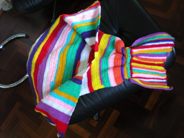 What is really special about this pattern is that you can stick your feet in the fin (that part of the blanket is a pocket for the feet) and then it opens up to a blanket on top, which you can wrap around your legs. Make it just long enough for your daugther or yourself. It's easy to change the size.