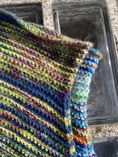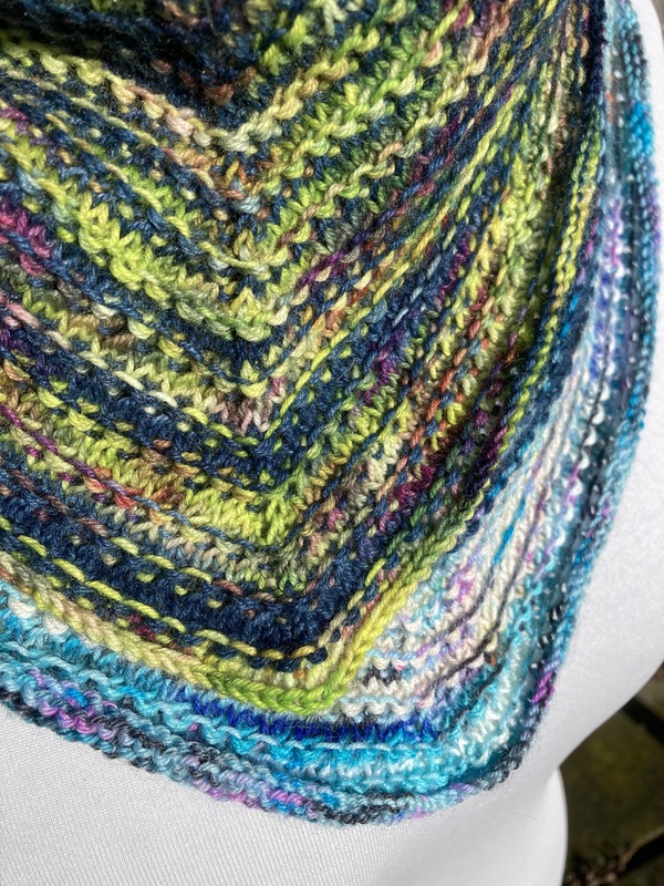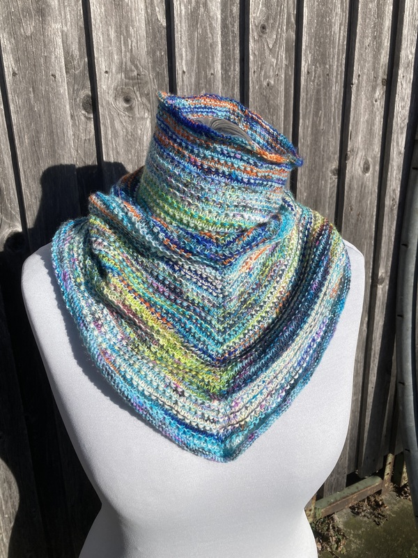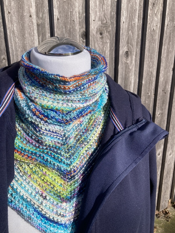 A soft colourful memory. You can knit this project from one skein of yarn in fingering weight. A skein bought at a yarn festival, during a fun knitting afternoon in the yarn shop or on holiday. Remember a good time with your finished memory bandana. Enjoy knitting.
