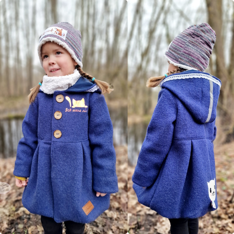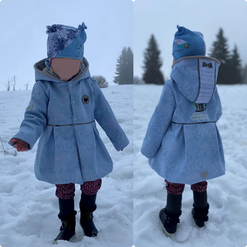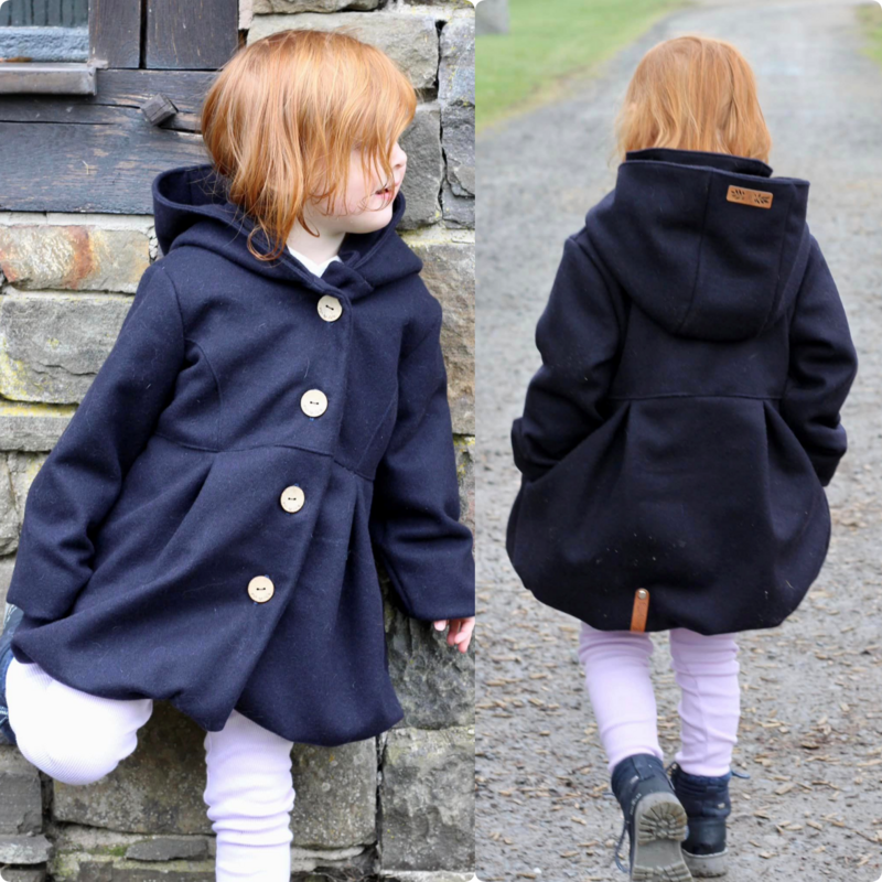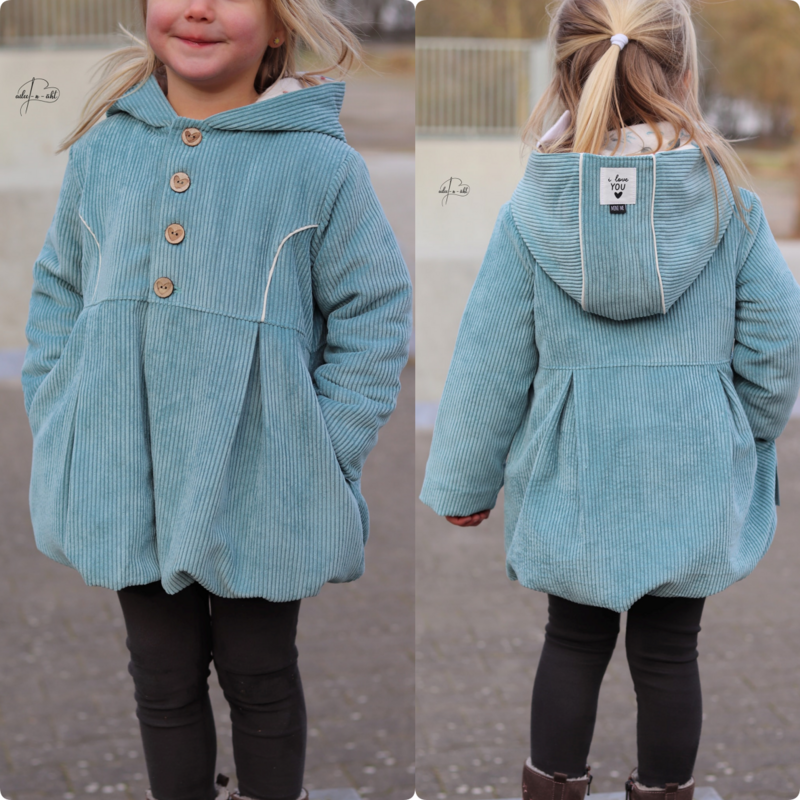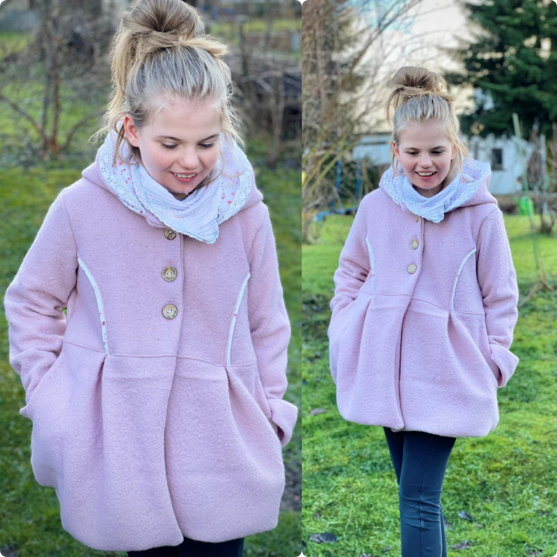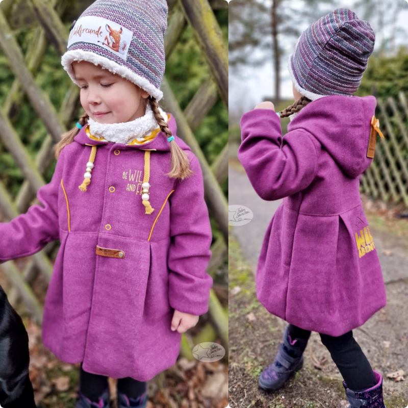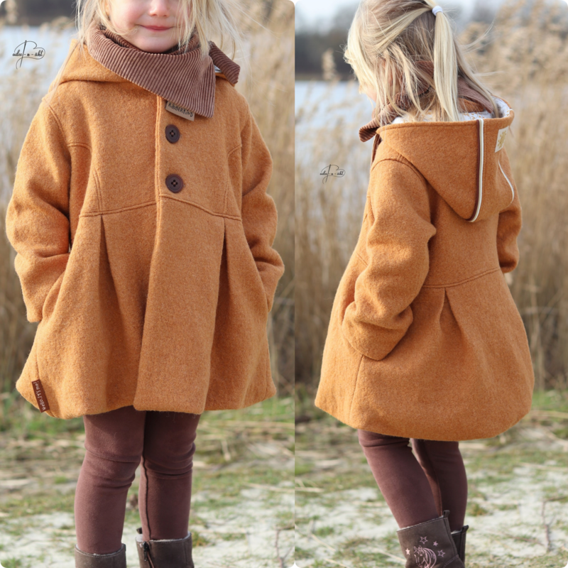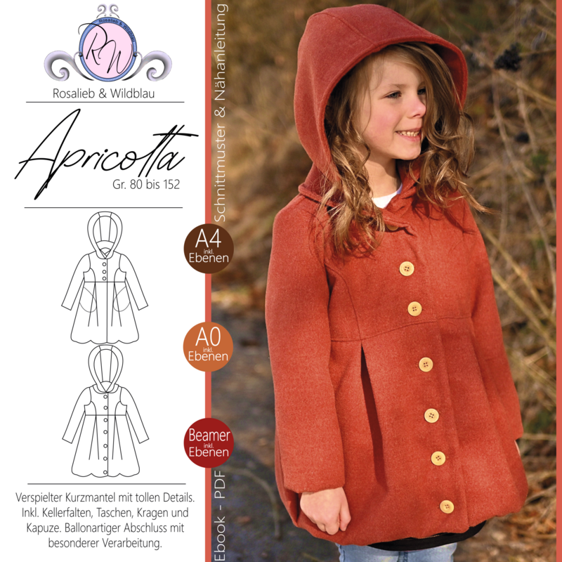 Apricotta ist das Schnittmuster zu einem verspielten Kurzmantel mit vielen schönen Highlights. Das Schnittmuster umfasst die Echtgrößen 80 bis 152 und passt bei einer Körpergröße von 80 bis 157cm. Apricotta kann aus verschiedensten, nicht dehnbaren Stoffen genäht werden und somit sowohl als Winterjacke, als auch als Übergangsjacke genutzt werden. Der Schnitt verfügt über eine freche Länge und einen ballonartigen Abschluss, welcher durch den Fall der integrierten Kellerfalten unterstützt wird. So entsteht eine tropfen- bzw. blütenartige Form. Abwechslung bringt der Kurzmantel durch den optionalen Kragen und die optionale Kapuze, welche natürlich auch in Kombination verwendet werden können. Wird der Kragen außen angebracht (also um die Kapuze herum), wird er beim Tragen umgelegt und bietet einen schönen Rahmen. Wird der Kragen innen angenäht, ist es ein kleiner Stehkragen, der zusätzlich für Wärme sorgt. Apricotta wird mit Belegen und einem Innenmantel aus Futterstoff genäht. Diese Details sorgen nicht nur für eine schöne Optik, sondern auch für einen hochwertigen Look. Optionale Taschen runden den Mantel ab.
