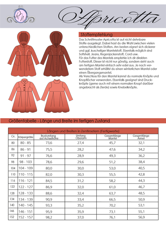 Das Schnittmuster ist in Echtgröße (du nähst hier nach Körpergröße) gradiert und enthält keine Nahtzugabe. Es umfasst die Größen 80 bis 152 und ist damit für eine Körpergröße zwischen 80 und 157cm geeignet. In den Dateien findest du die A4-Versionen zum Ausdrucken, einen Großdruck sowie die Beamerdatei - alle Versionen inkl. Ebenen zum Ein- und Ausblenden der Größen. Apricotta ist auf nicht dehnbare Stoffe wie Mantelstoff, Walk, Jeans, Cord, Regenmantelstoff und Futterstoff ausgelegt.
