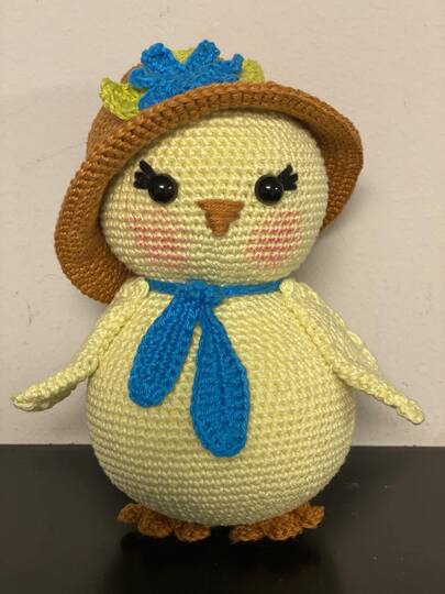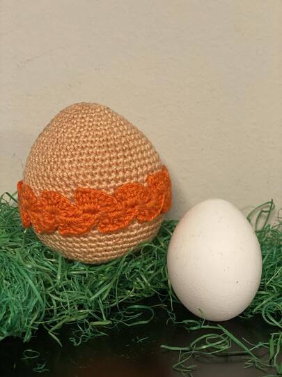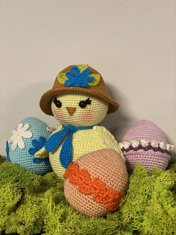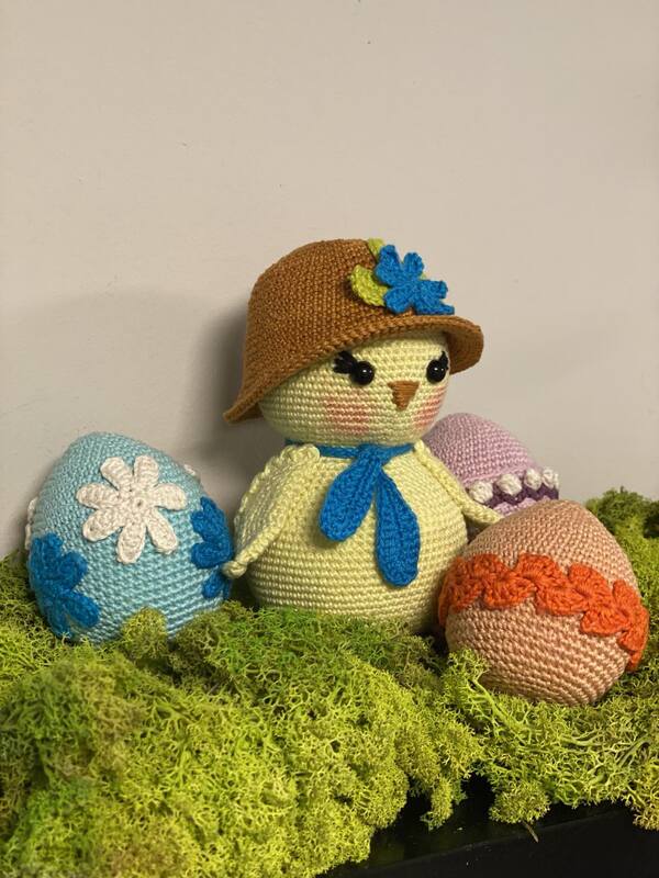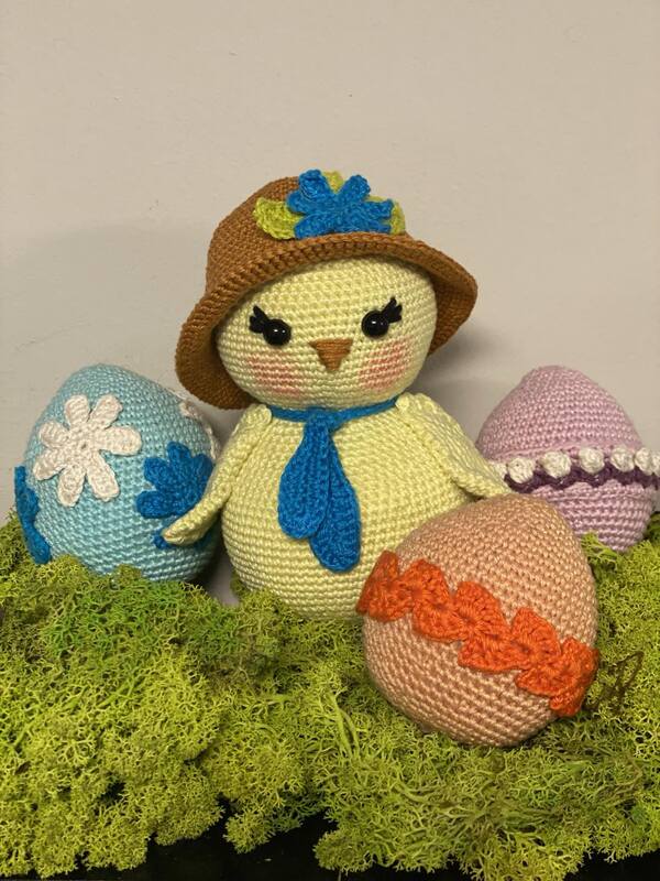 If you use the materials as advised below the final size of the chick is going to be about 16 cm, the big egg 11 cm and the small egg 9 cm.