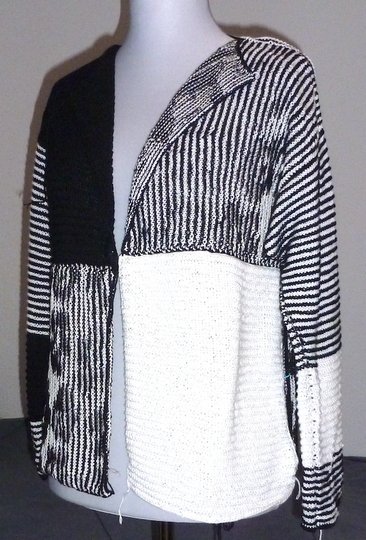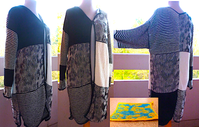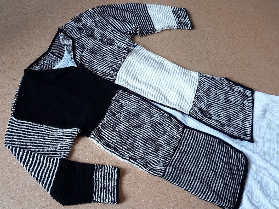 Hier werden damit Quadrate gestrickt, die sich mit gestreiften Quadraten und unifarbenen abwechseln. Die Größe dieser Quadrate wird für die benötigte Konfektionsgröße angepasst.