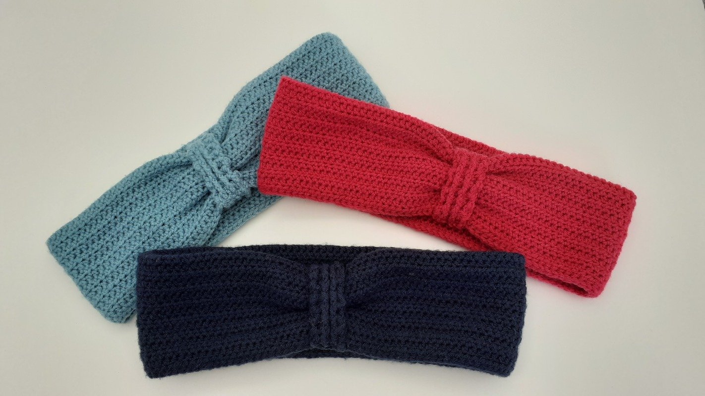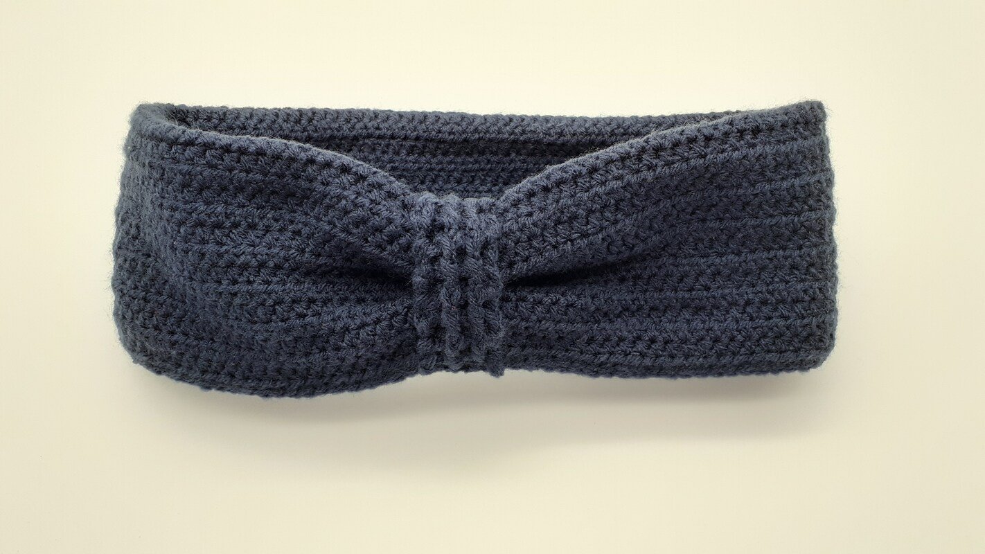 Das Stirnband ist ca. 8 cm breit und für einen Kopfumfang von ca. 57 cm gehäkelt. Gemessen wird vom Nacken zur Stirn.